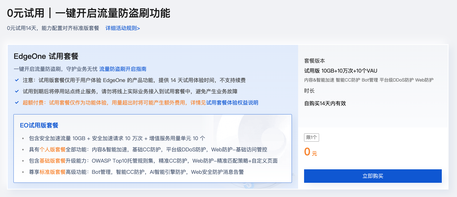 为了让您能够体验 EdgeOne 更多的功能,更好更清晰的选择与自己业务最匹配的套餐版本,EdgeOne 提供了免费的试用版套餐,领取后可以快速试用与标准版套餐功能对齐的所有功能。