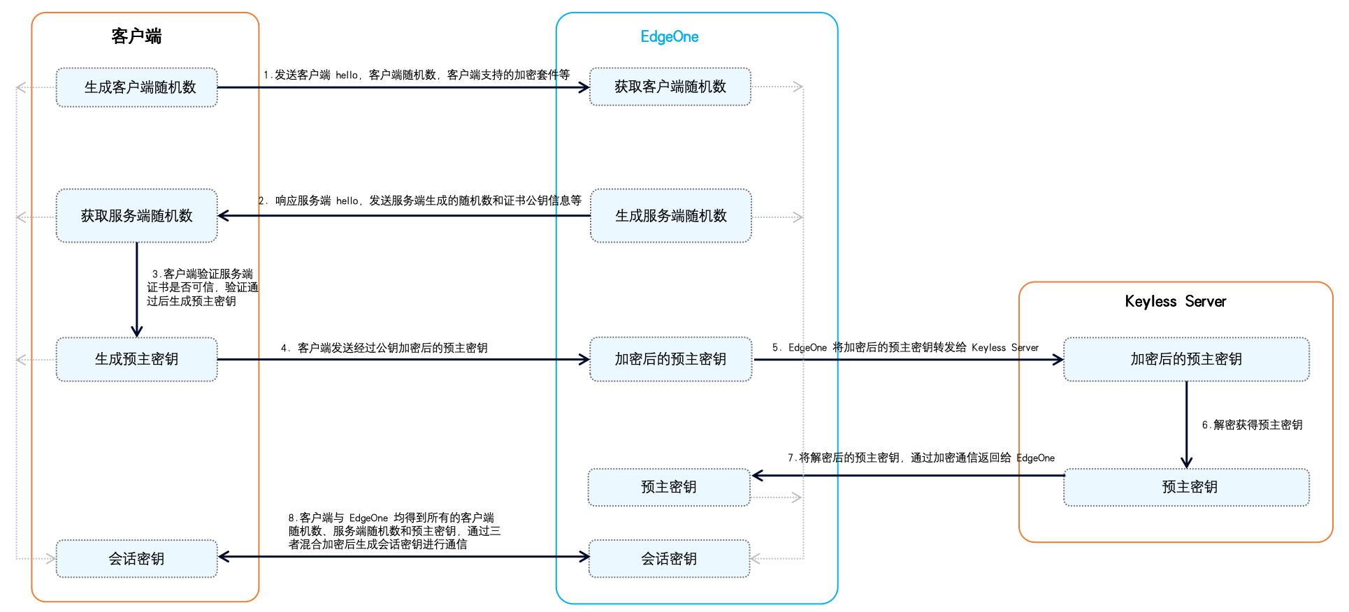 EdgeOne 当前已支持了 Keyless 无私钥证书方案,为了进一步保障证书私钥的安全性,支持用户仅部署域名证书的公钥部分到 EdgeOne 边缘节点内,用户可以自行存储私钥部分,在需要使用私钥证书时,可向存储 Keyless 服务端发起请求来使用私钥解密相关数据。与 HTTPS 单向认证握手的正常流程不一样的地方主要是在服务端收到加密后的预主密钥信息后,EdgeOne 将把该信息转发给 Keyless Server,由 Keyless Server 完成解密,并将解密后的预主密钥信息通过加密通信返回 EdgeOne。