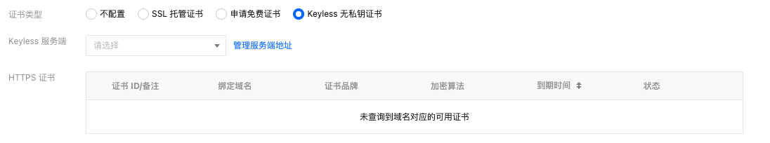 6. 找到需要配置的域名,在 HTTPS 配置一列,单击编辑,进入 HTTPS 配置页面,选择使用 Keyless 无私钥证书。