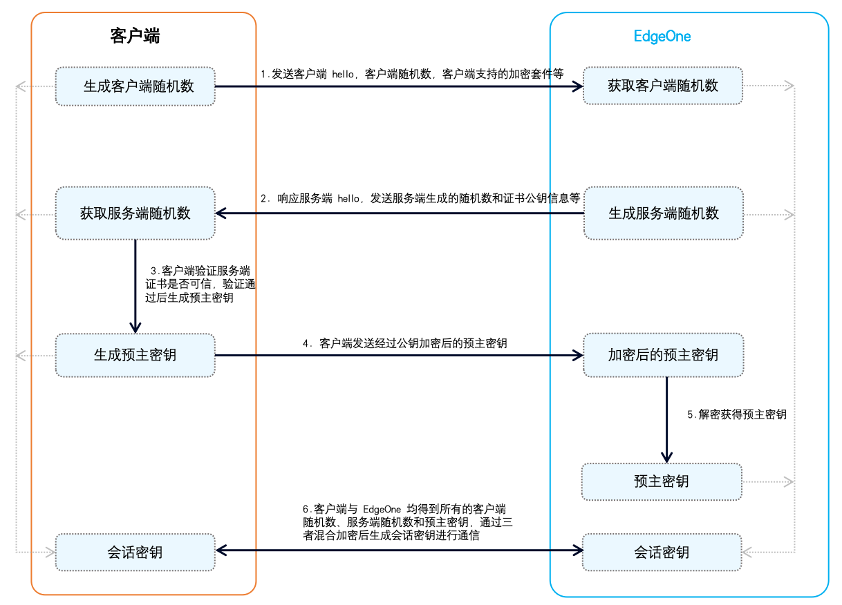 4. 确认证书验证通过后,客户端将根据当前加密算法生成一个预主密钥,并使用该证书内的公钥对预主密钥加密后发送给 EdgeOne;
