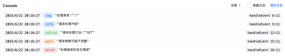function handleEvent(event) {const { request } = event;const url = new URL(request.url);// 输出基础信息console.log('处理请求:', url.pathname);// 输出提示信息console.info('请求处理开始');// 输出注意信息console.notice('请求处理方法:', request.method);// 输出警告信息console.warn('请求参数可能不完整');// 输出错误信息console.error('处理请求时发生错误');return event.respondWith(new Response('Hello World'));}addEventListener('fetch', event => {handleEvent(event);});
