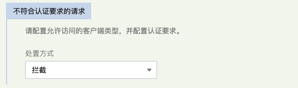 不满足认证要求时,处置请求的方式:未集成客户端 SDK 或提供的认证凭证不合法时,使用指定方式进行处置。