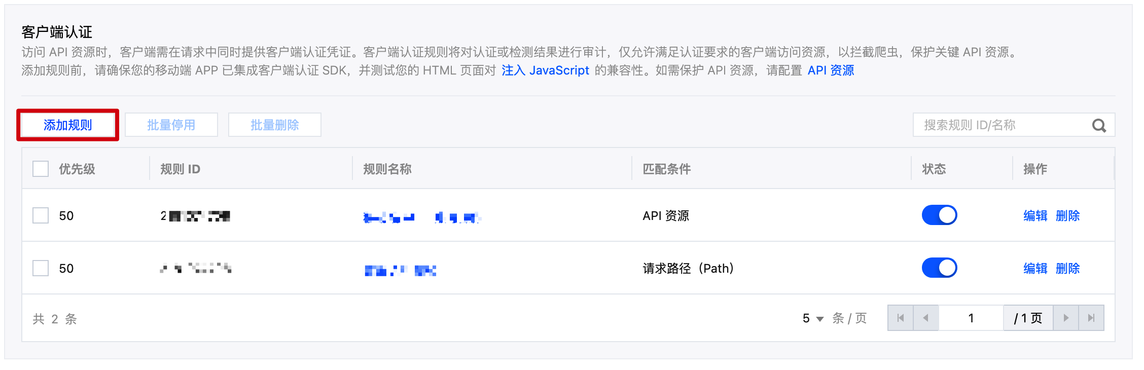 。3. 定位到 Bot 管理卡片,单击客户端认证下方的添加规则,进入配置页面。
