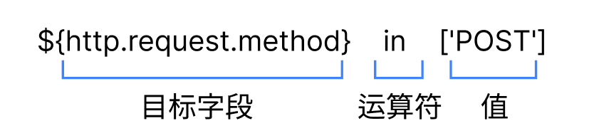${http.request.uri.path}、${http.request.method} 等,用于提取请求中的特定信息。运算符:例如 in、matches、exists 等,用于判断目标字段与值之间的关系。