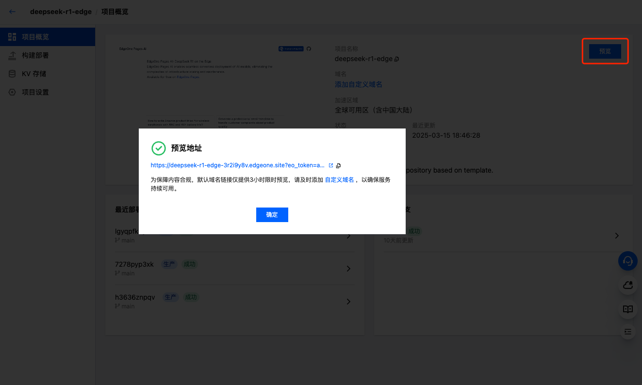 成功部署后可点击项目概览的预览按钮生成预览链接,来快速验证部署成果。