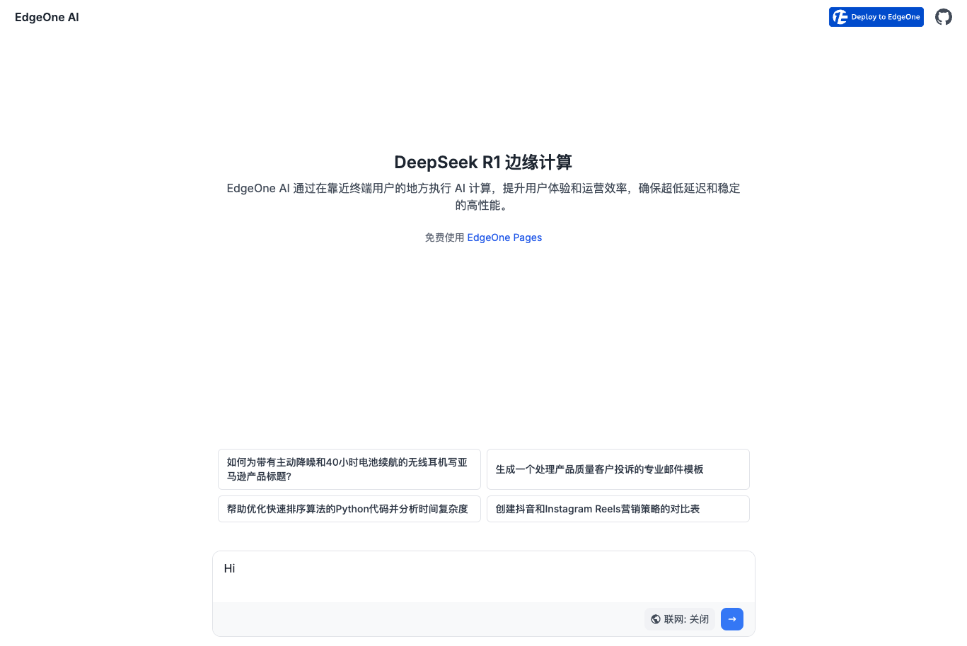 EdgeOne Pages 的 DeepSeek AI 聊天模板,为开发者提供了一个在边缘节点部署 AI 应用的可能性。尽管目前还处于初期阶段,它已展现出巨大的潜力。我们诚挚邀请广大开发者试用这个模板,体验边缘节点上 DeepSeek 的同时也感受 Pages 的便捷与高效,也期待您的宝贵反馈,帮助我们不断完善 Pages 的体验。