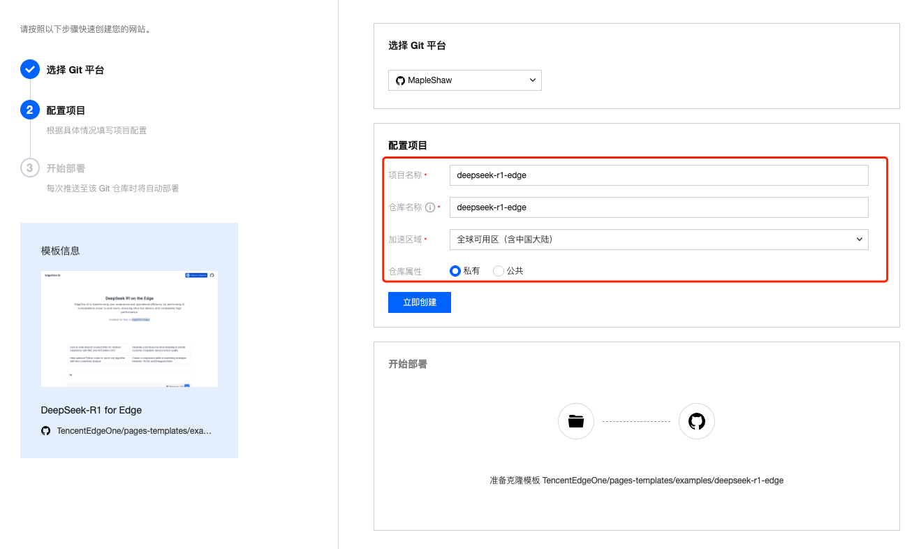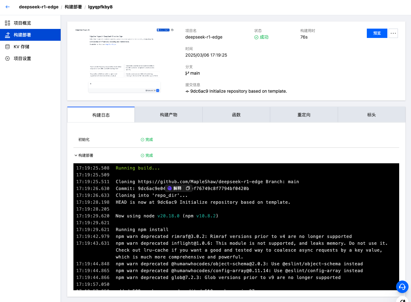 项目创建成功后会进入部署流程,可在构建部署的详情页查看部署过程。