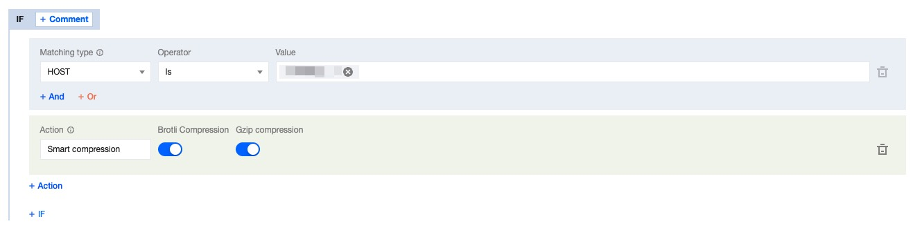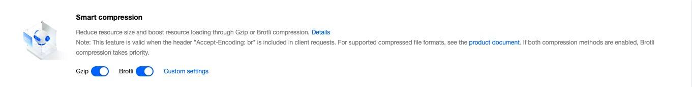 Accept-Encoding: br, gzip, Accept-Encoding: br, or Accept-Encoding: gzip, the node will intelligently compress based on the file's Content-Type. This compression effectively reduces the size of the resources and accelerates the transmission speed of the content. Enabling intelligent compression can assist you in:1. Enhance User Experience: By reducing resource size, the loading speed of web pages can be significantly improved, thereby providing a superior user experience. Particularly for websites with a wealth of CSS, JavaScript, and other resources, enabling compression can drastically cut down on loading times.