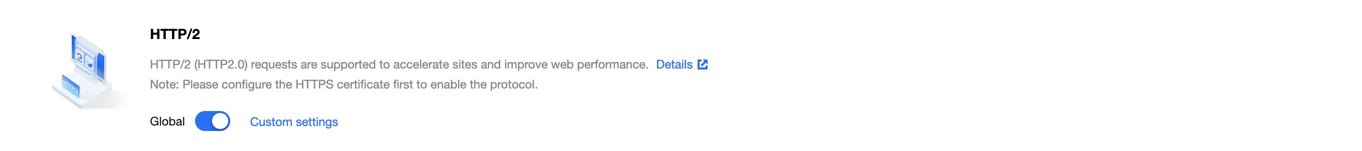 3. Locate the HTTP/2 configuration card. By default, it is enabled, meaning that it supports site acceleration using HTTP/2 by default. You can toggle the switch to configure it on or off.