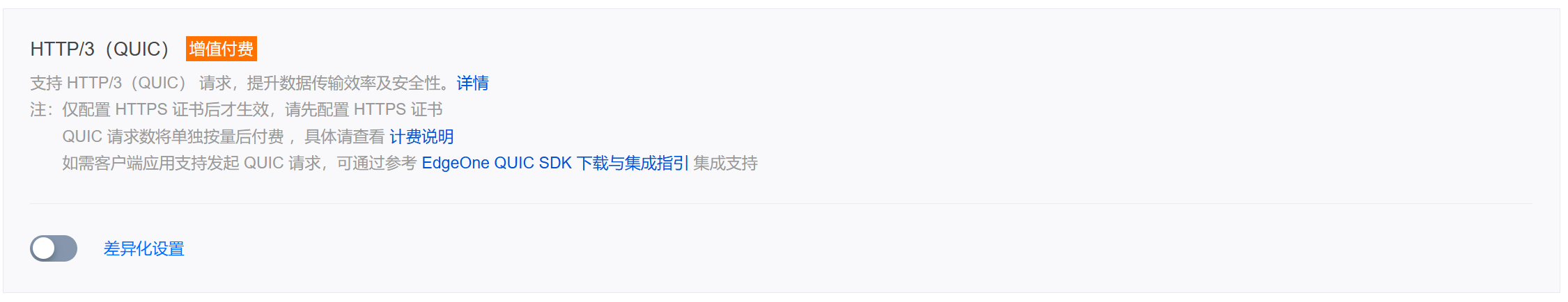 开启状态:支持 HTTP/3 请求,使用 HTTP/3 加速站点请求。