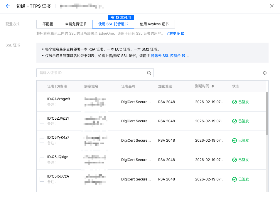 5. 在配置方式中,选择 SSL 托管证书,可自动带出当前可部署于该域名的证书列表,选择需关联的证书 ID,单击确定,即可下发证书配置。