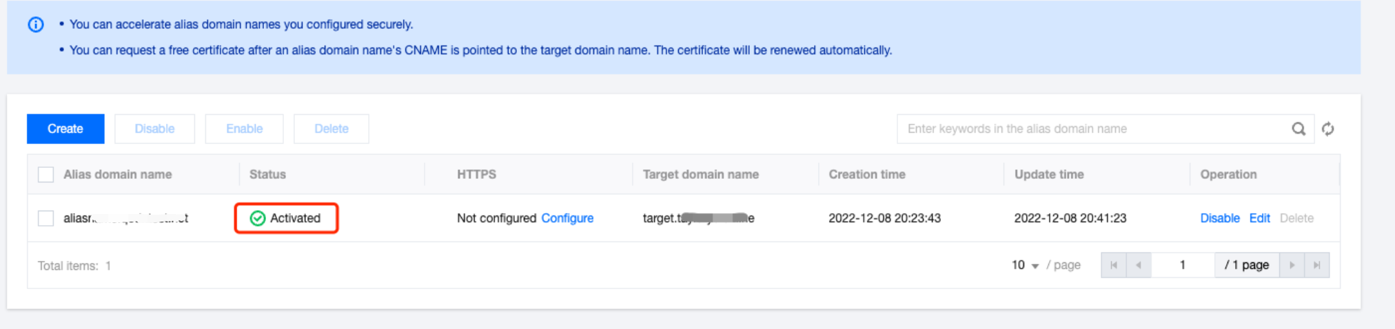 2. Upon the addition of the CNAME record, EdgeOne automatically conducts a check and adjusts the status of the alias domain name to "Activated", signifying that the current configuration has been successfully implemented.