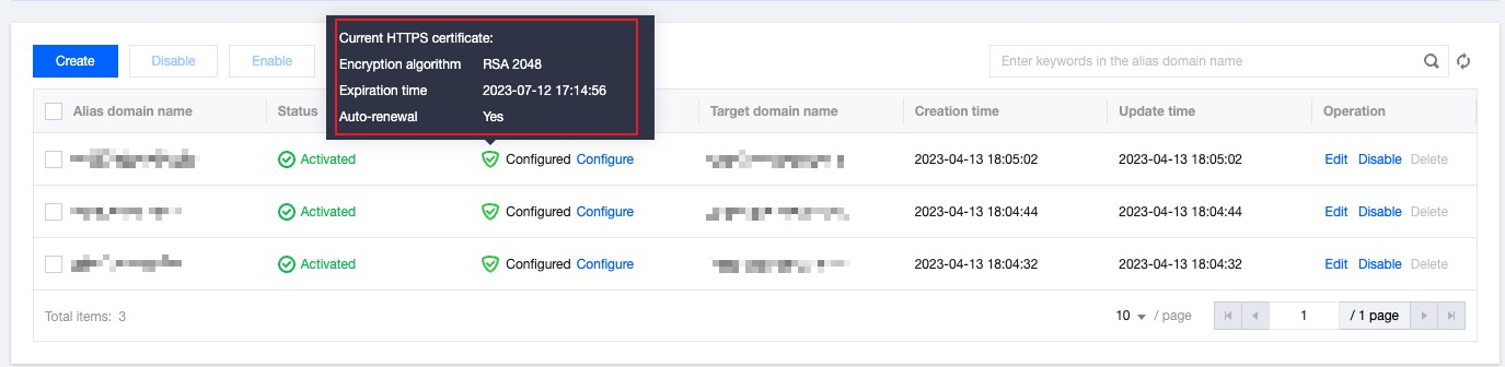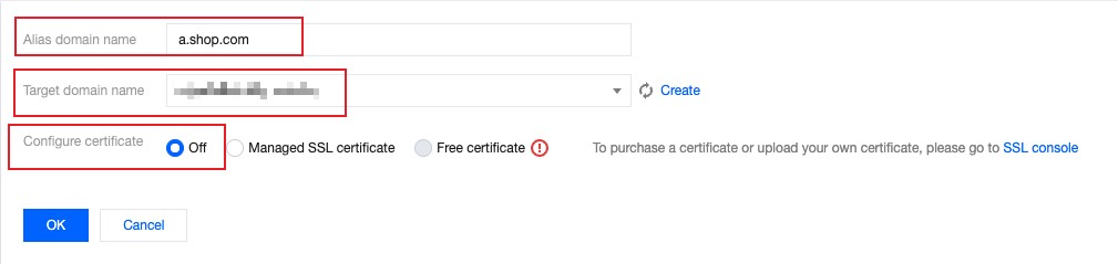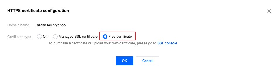 After you configure the CNAME record for the alias domain name by following Step 2, apply for a free HTTPS certificate as follows: