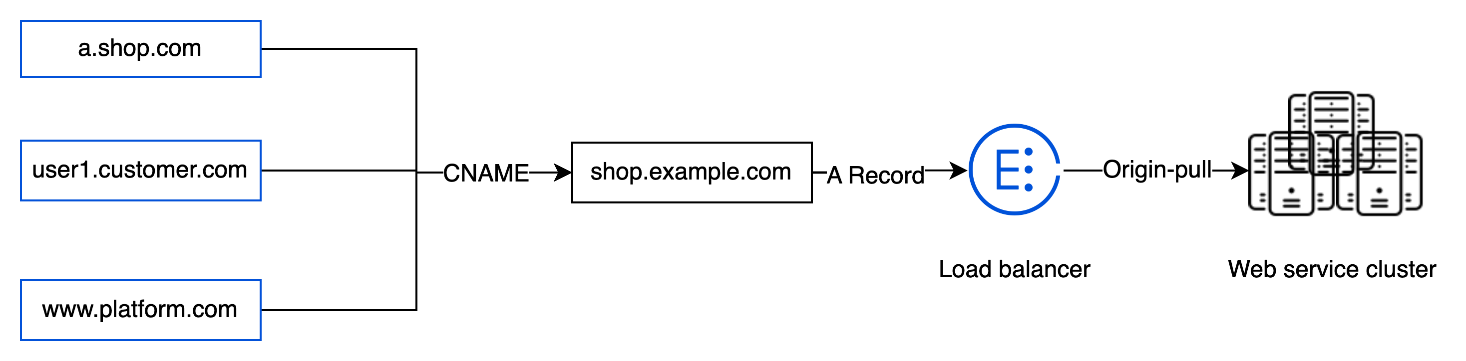 By employing the EdgeOne alias domain name scheme, users can more conveniently address this issue. SaaS website users only need to prepare a generic domain name to access EdgeOne's security acceleration services and use it as the target domain name. The customer's custom site domain name can access EdgeOne through the alias domain name. You can understand how alias domain names work through the principle of alias domain names. This scheme can assist SaaS website service providers in resolving the following issues:
