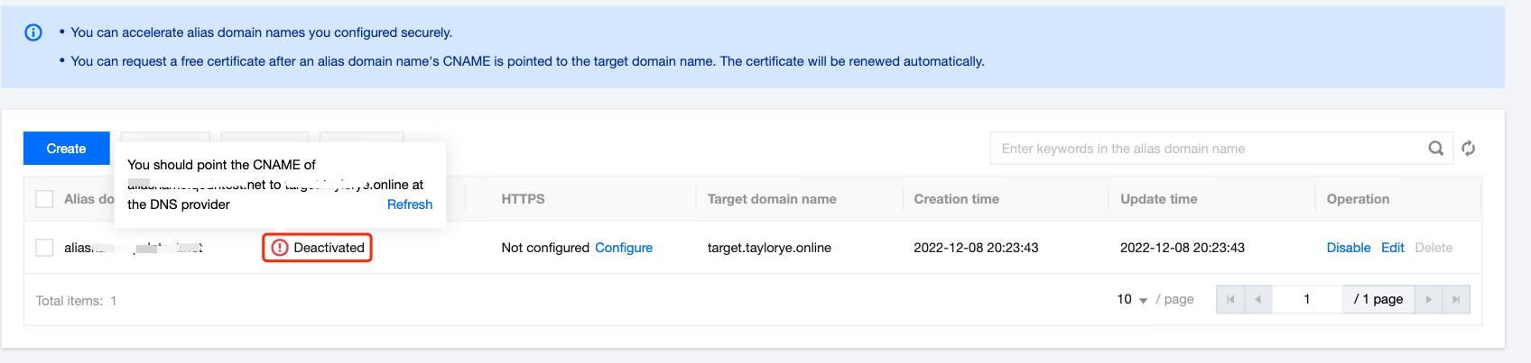 You must point the CNAME record of the added alias domain name to the target domain name to activate the alias domain name. Only active alias domain names support the application of free certificates.