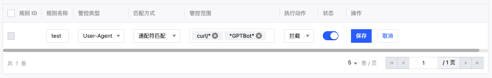 4. 填写规则名称,配置管控类型、匹配方式及管控范围。以示例场景为例,管控类型为 User-Agent 管控,当User-Agent 通配符匹配