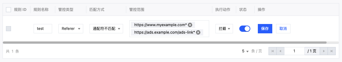 4. 填写规则名称,配置管控类型、匹配方式及管控范围。以示例场景为例,管控类型为 Referer 管控,当 Referer 通配符不匹配