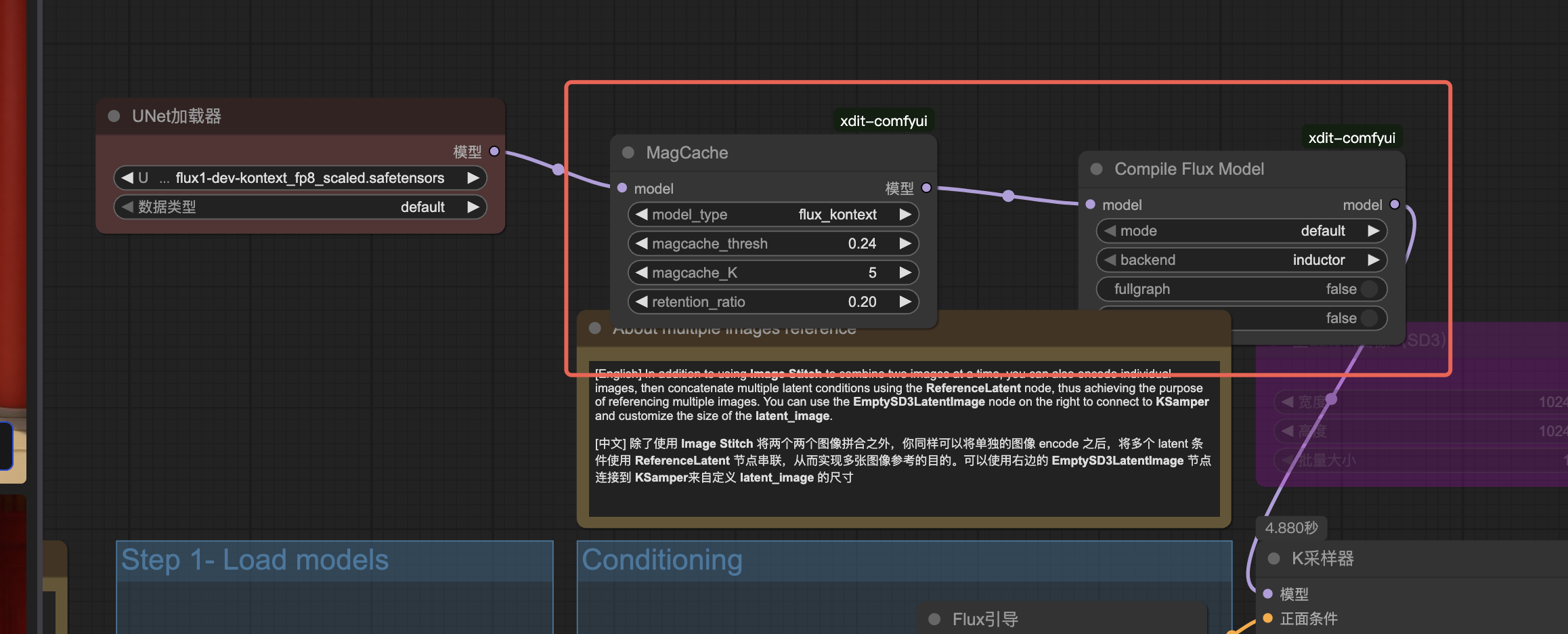 客户按需将工作流放到模型加载器(如果有 lora,放到 lora 加载器之后即可)之后,单击运行即可。MegCache 节点和 Compile Flux Model 节点可单独使用也可以配套使用。