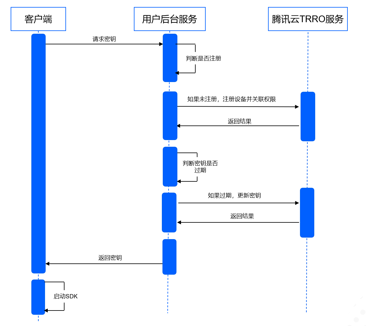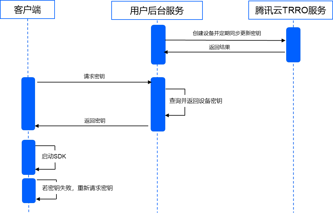 用户后台服务维护 TRRO 的设备注册、密钥更新和权限管理,当密钥或权限关系发生变化时,调用 TRRO 服务 API 接口进行同步。客户端登录时,会请求用户后台服务获取最新的设备密钥。