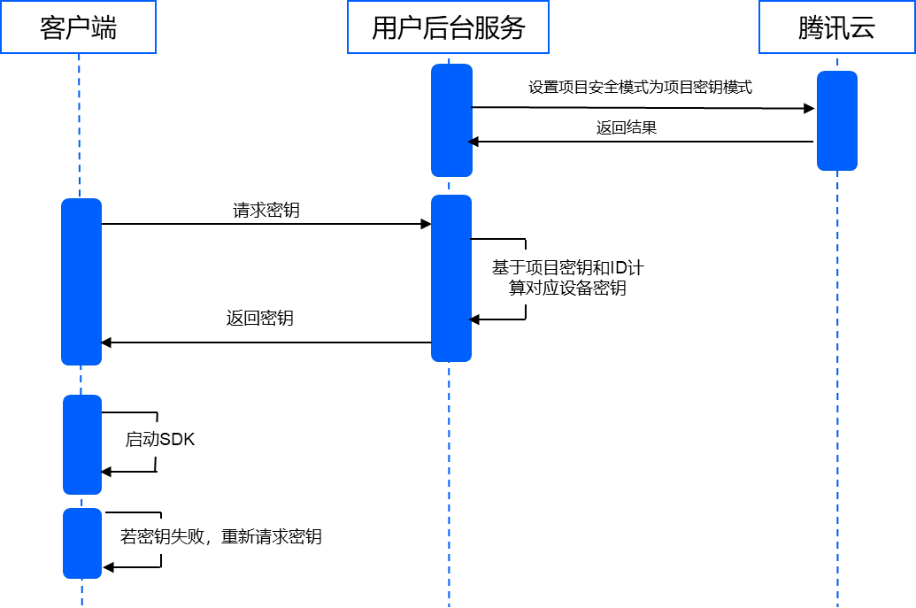 用户后台服务在 TRRO 服务开启项目共享密钥模式。通过 免注册登录与临时会话授权 中生成算法,基于项目共享密钥生成对应设备密钥返回给客户端。如果设置了白名单模式的话, 在发起视频连接时,客户端还需要向用户后台服务申请临时会话授权以获得设备视频观看权限。