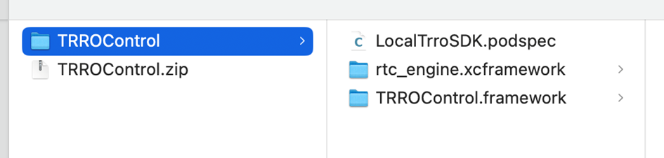 1. 将 TRROControl.zip 解压至目标目录,解压后包含三个文件:LocalTrroSDK.podspec、rtc_engine.xcframework、TRROControl.framework。
