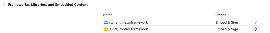 1. 将 rtc_engine、TRROControl 两个 framework 库拖入 Link Binary With Libraries 中。