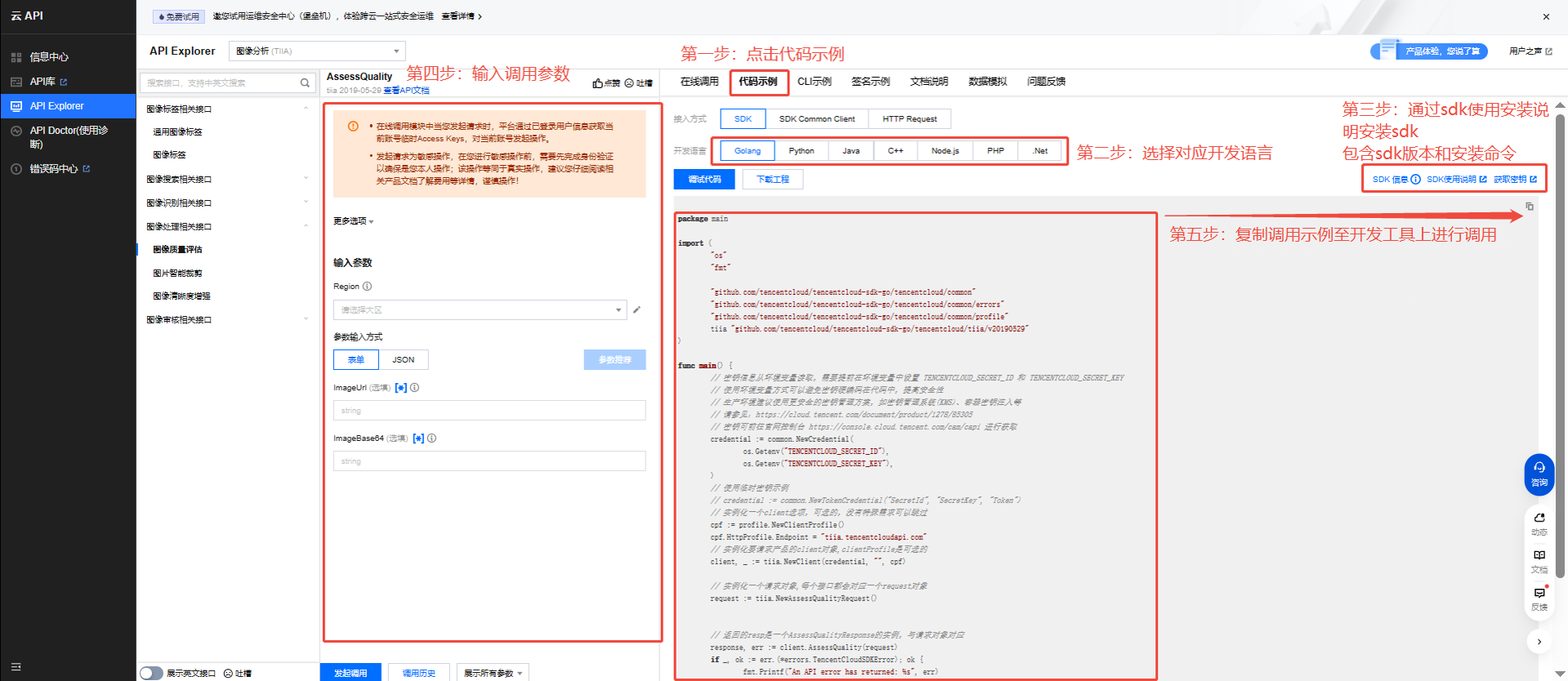 单击代码示例,可以查询到目前可以安装 SDK 的开发语言,选择安装对应版本的 SDK 进行调用,如下图: