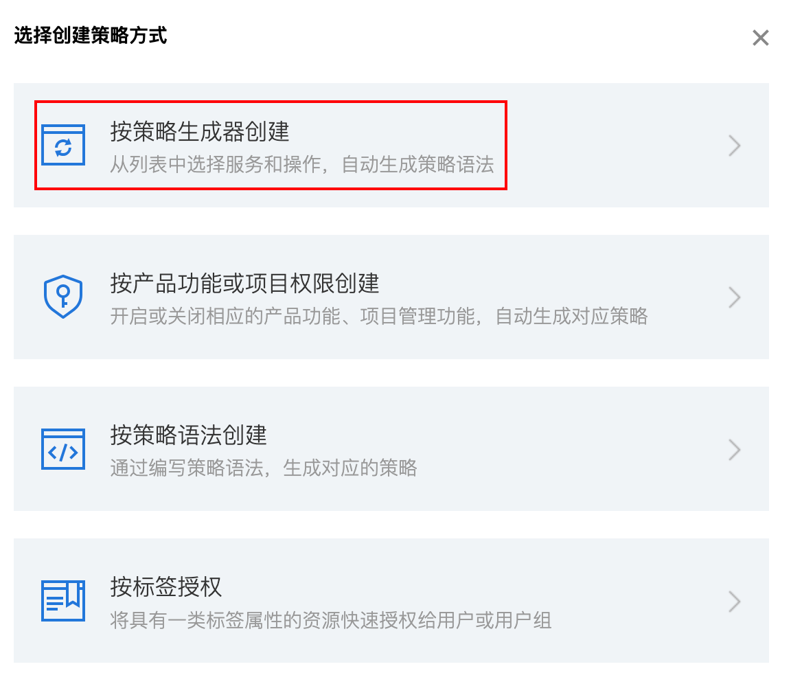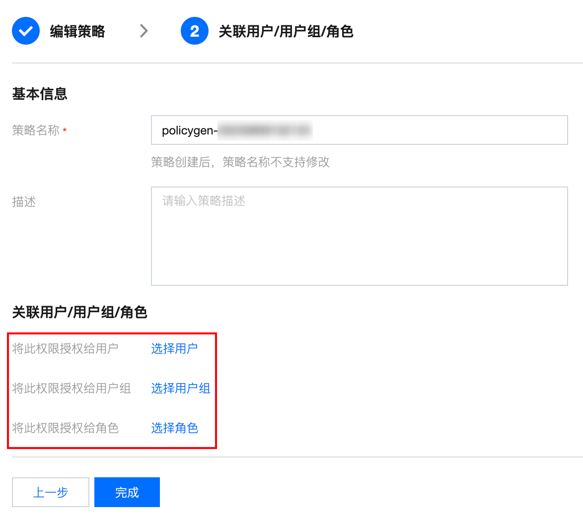 5. 单击下一步,填写策略名称、并给子账号增加权限,单击完成即可。