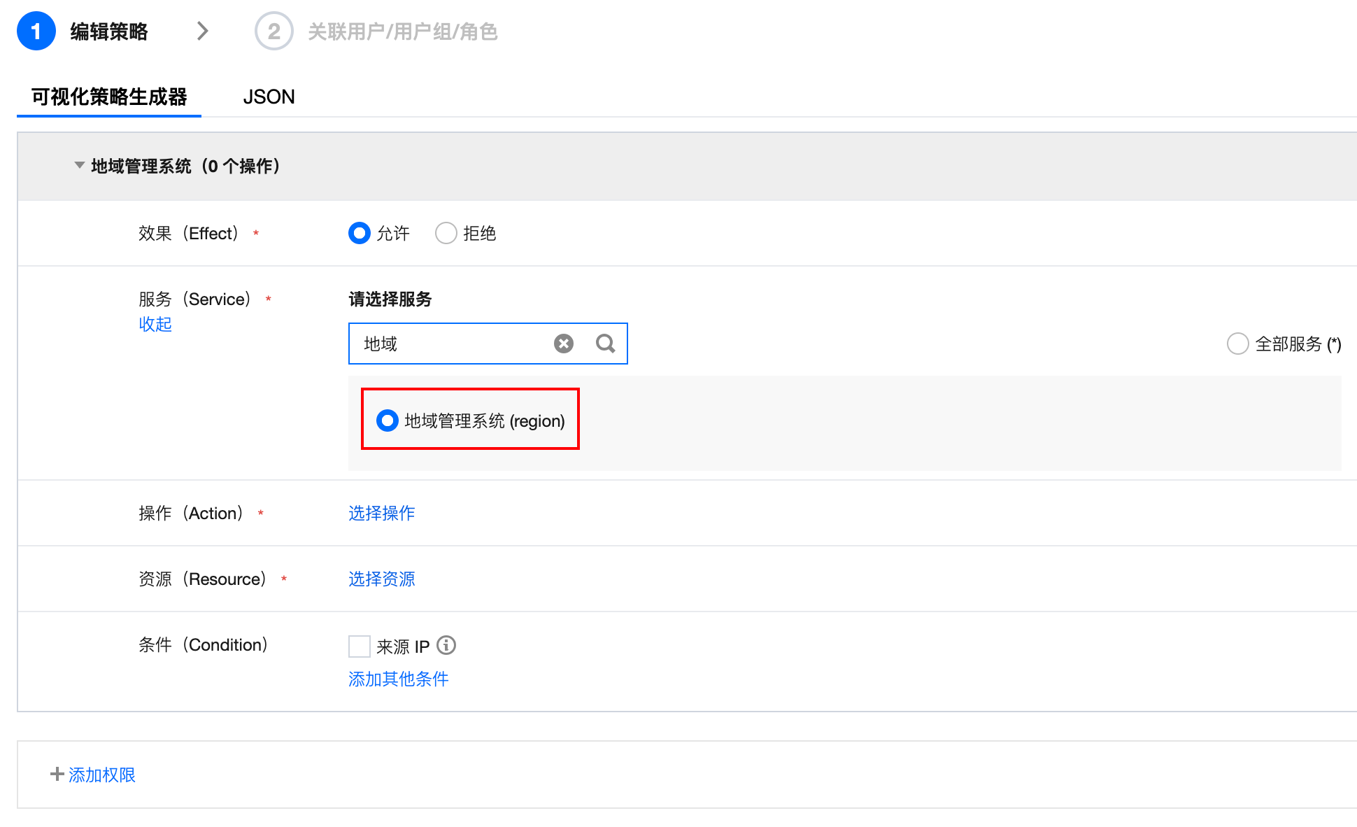 4. 请选择服务:地域管理系统(region),选择对应的操作和资源。