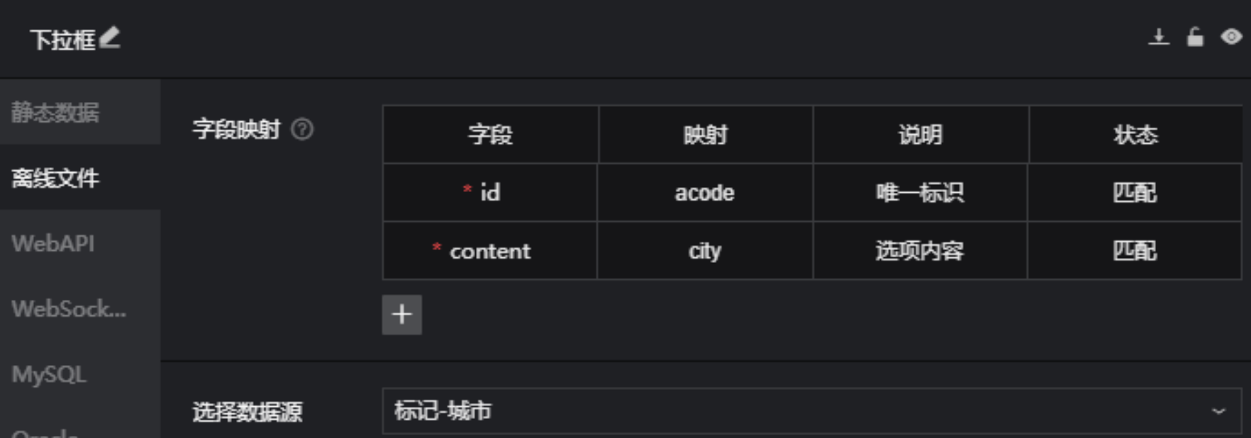 2. 在编辑页面添加下拉框组件,单击数据模块选择离线文件,添加该数据源。