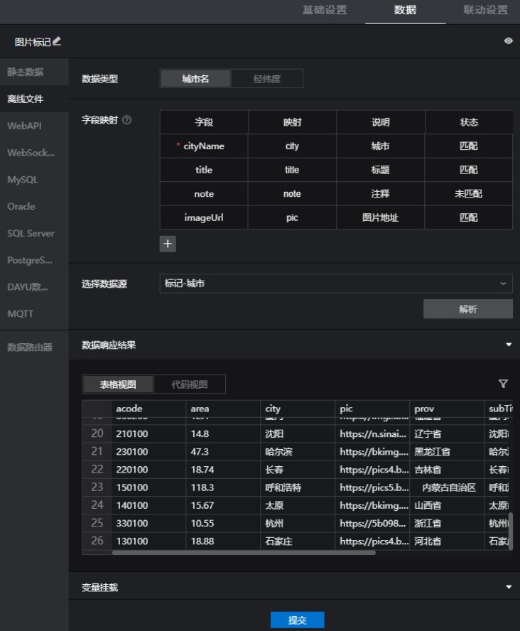 3. 场景选择中国版块,并添加三维标记图片标记,将图片标记添加刚上传的离线文件内容。
