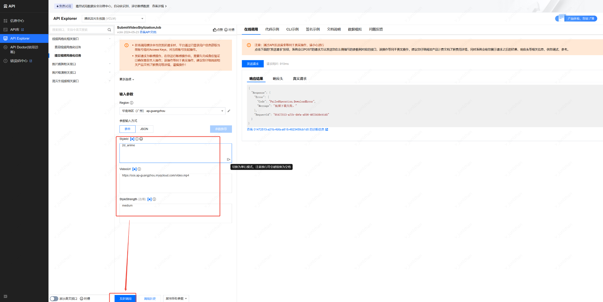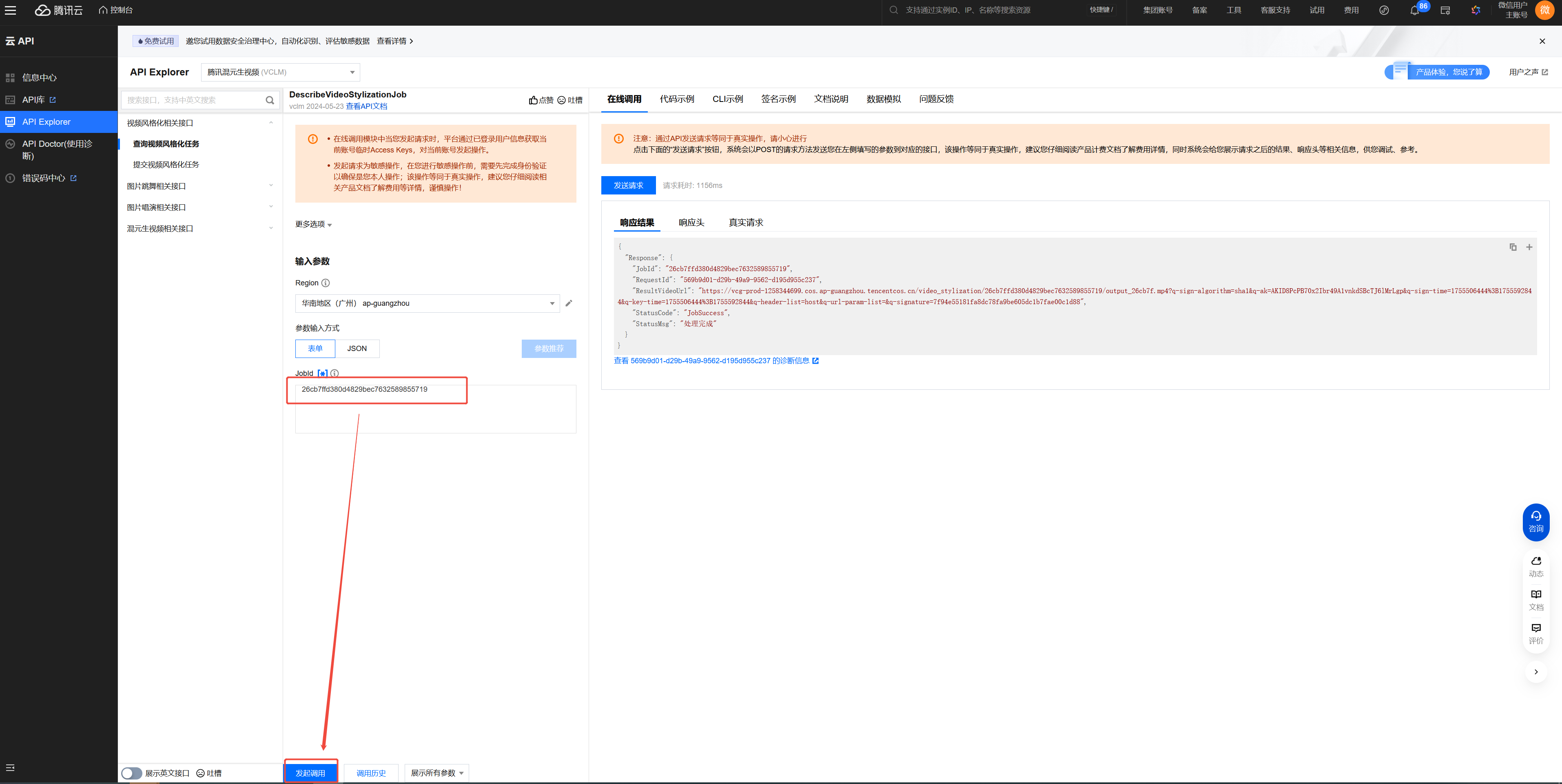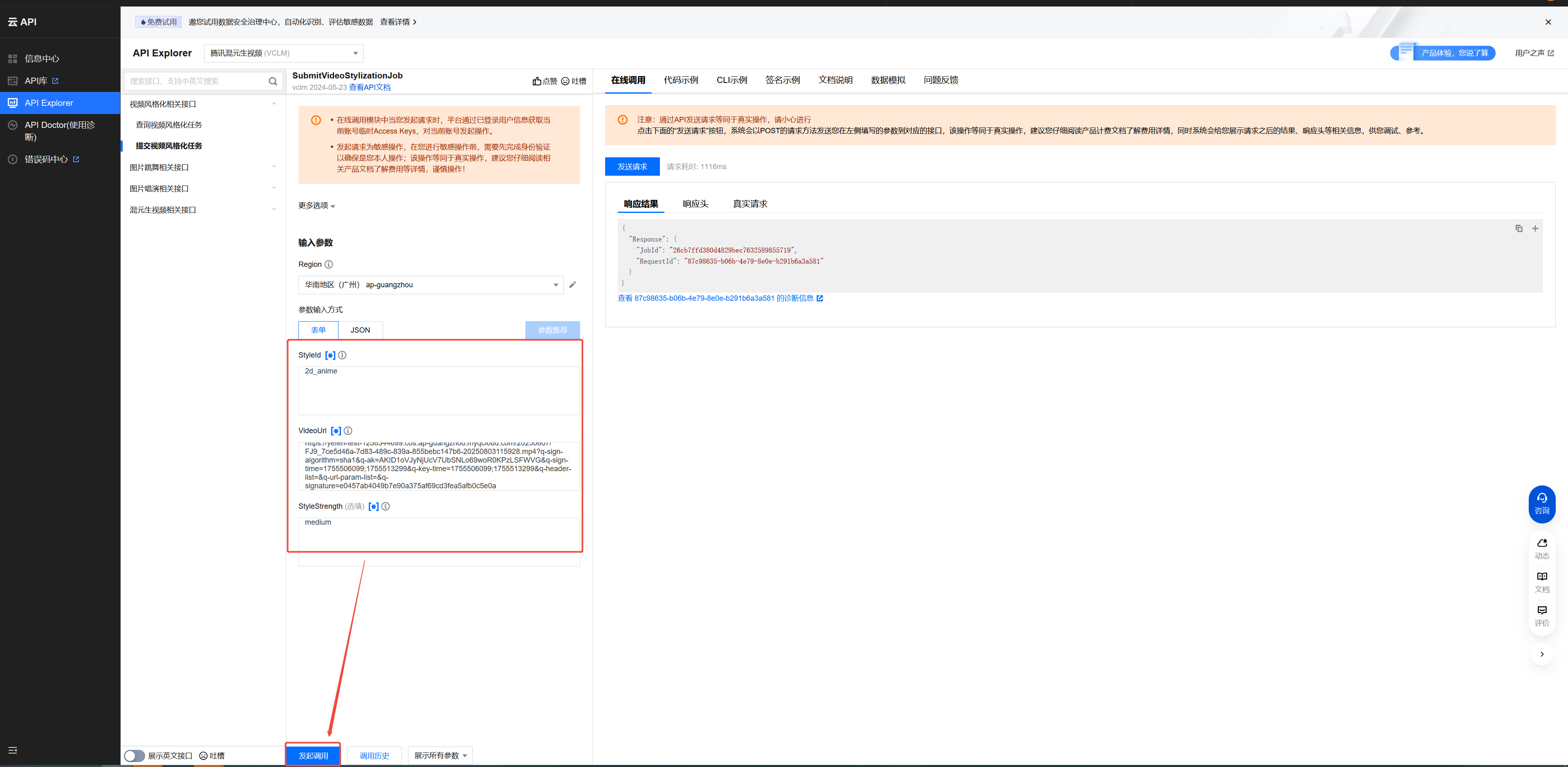 调用提交视频风格化任务接口:输入参数之后点击发起调用,会返回提交视频风格化任务的结果信息。