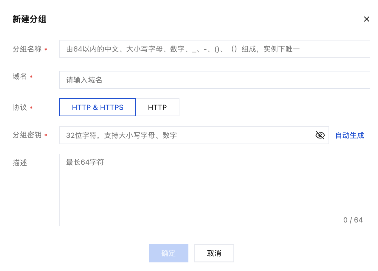 分组密钥 | 必填,最长32个字符,支持大小写字母、数字,可自动生成 |