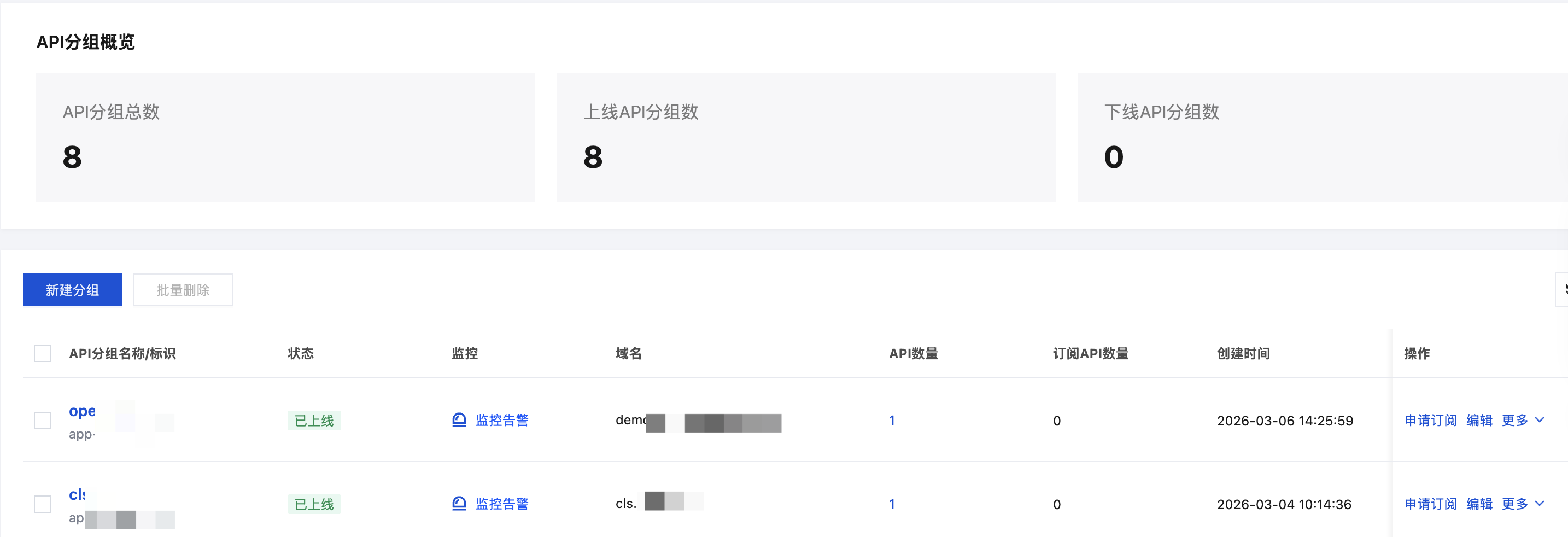 监控 | 您可以单击跳转到监控告警页面,然后单击设置告警跳转腾讯云监控平台,针对您的 API 分组设置告警策略 |