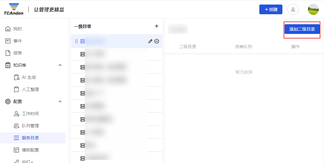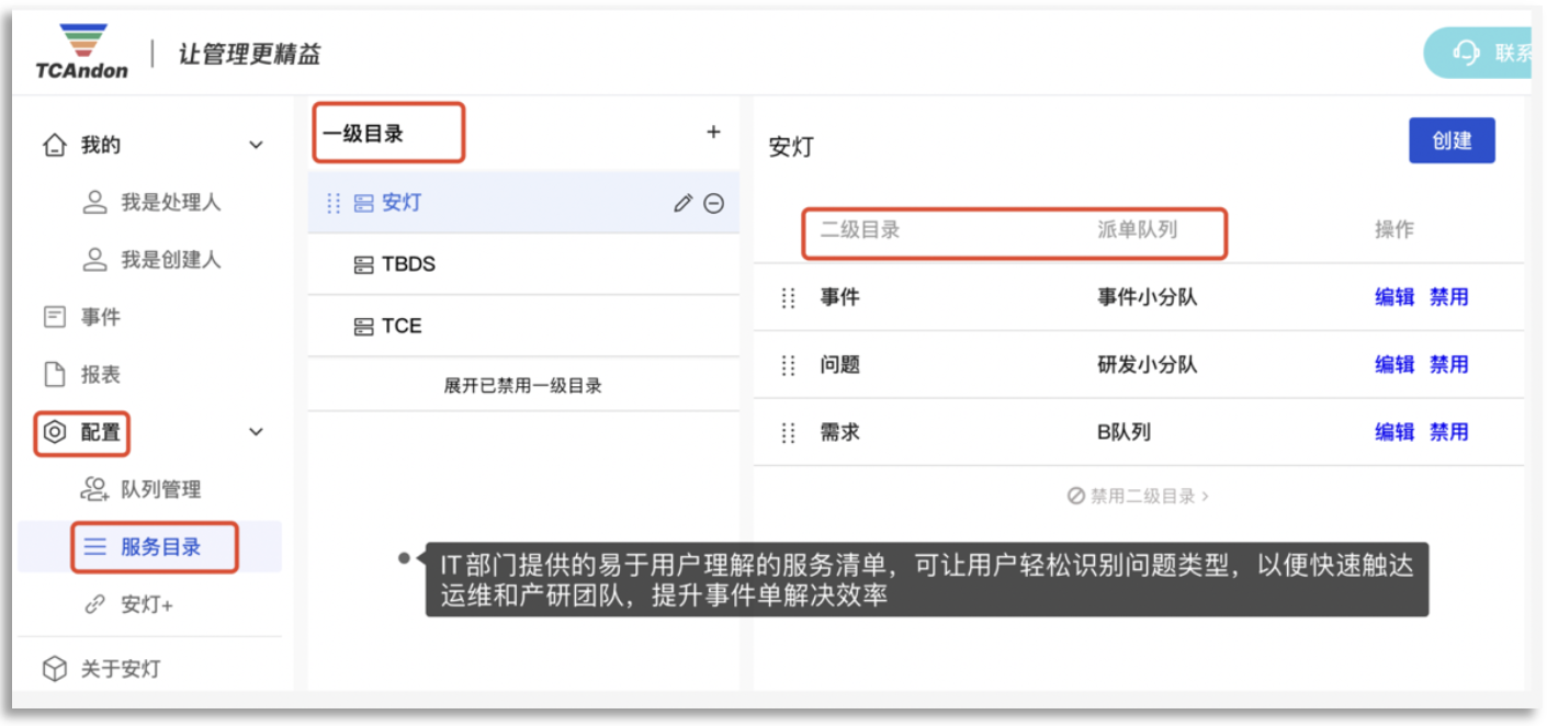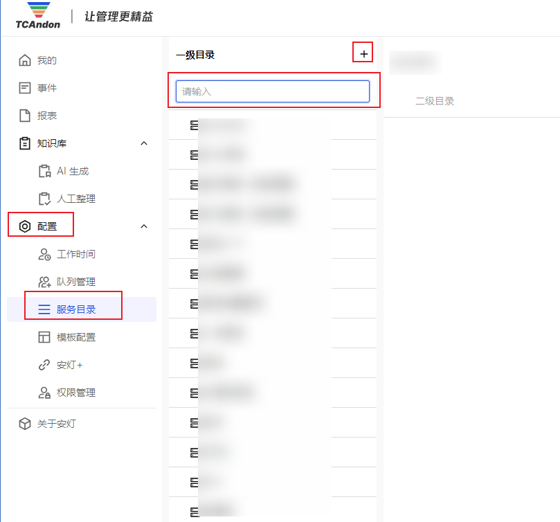 1. 在安灯界面,选择配置 > 服务目录 > 一级目录,单击加号,在下方输入一级目录的名称。