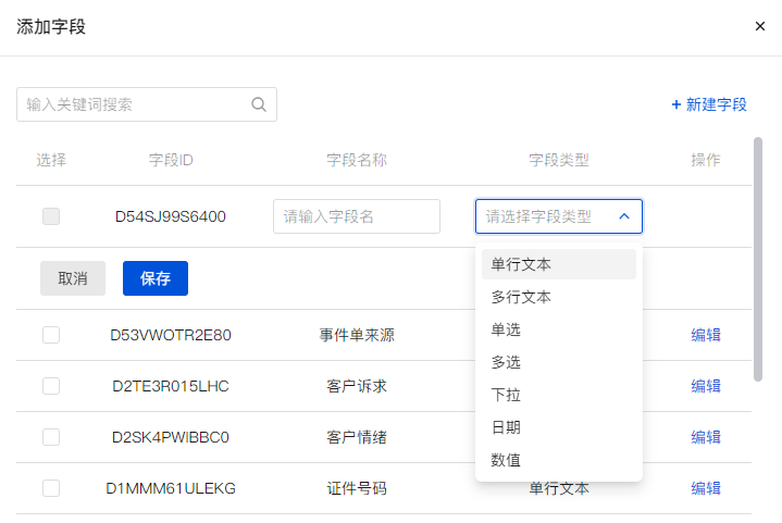 3. 在展开的字段配置弹窗中添加或编辑字段,需要必填字段名称、字段类型和是否必填这三个属性,配置完成后,单击提交。