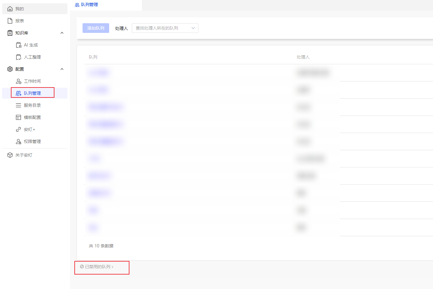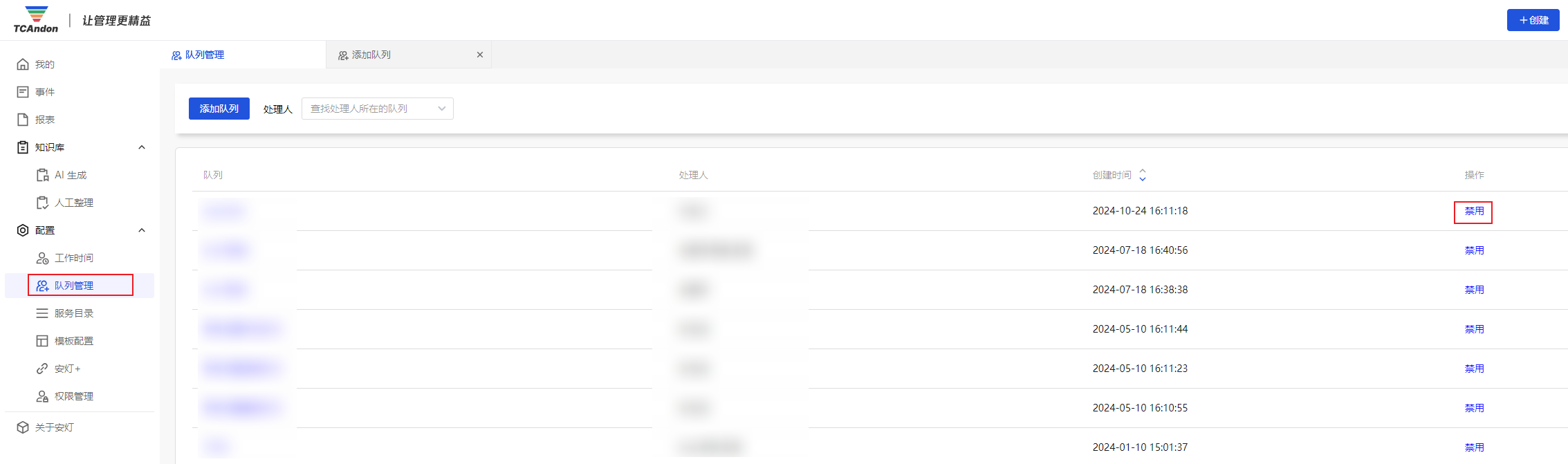 管理员可以单击禁用后,禁用队列。这项操作可能会影响服务目录(导致某一目录无可用处理队列)。