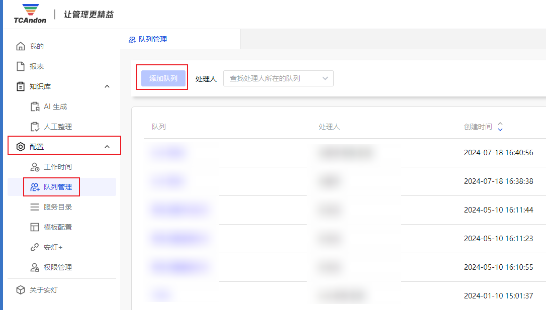 管理员需要提前进行配置才可以让企业的其他同事使用,需要配置的页面有队列管理、服务目录、模板配置和权限管理。