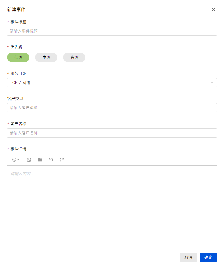 服务目录定义了组织提供的所有服务和服务产品名录。服务目录由两级构成,一级目录和二级目录,是提单页面的必填字段。配置页面如下: