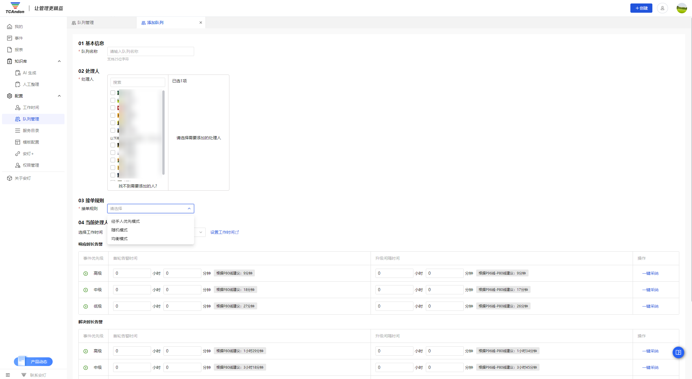 2. 填写并选择自己所需和方式,内容有基本信息、处理人、接单规则、当前处理人 OLA 告警。