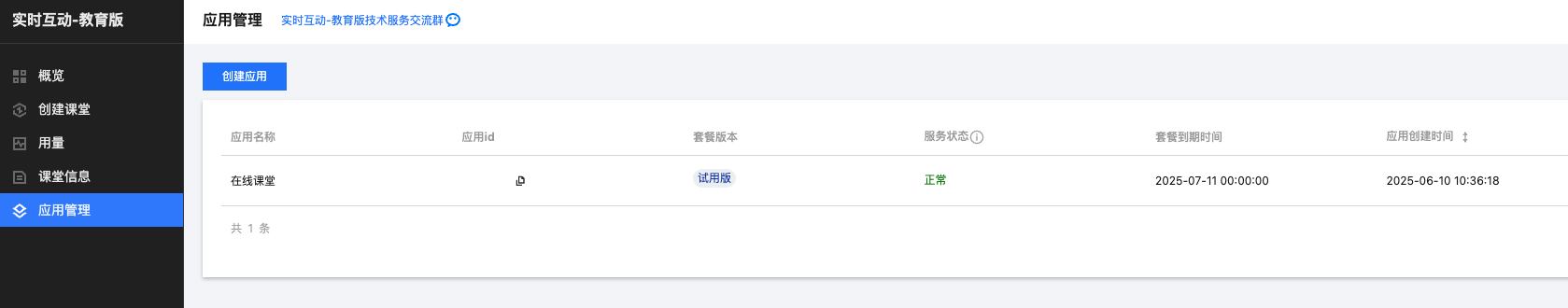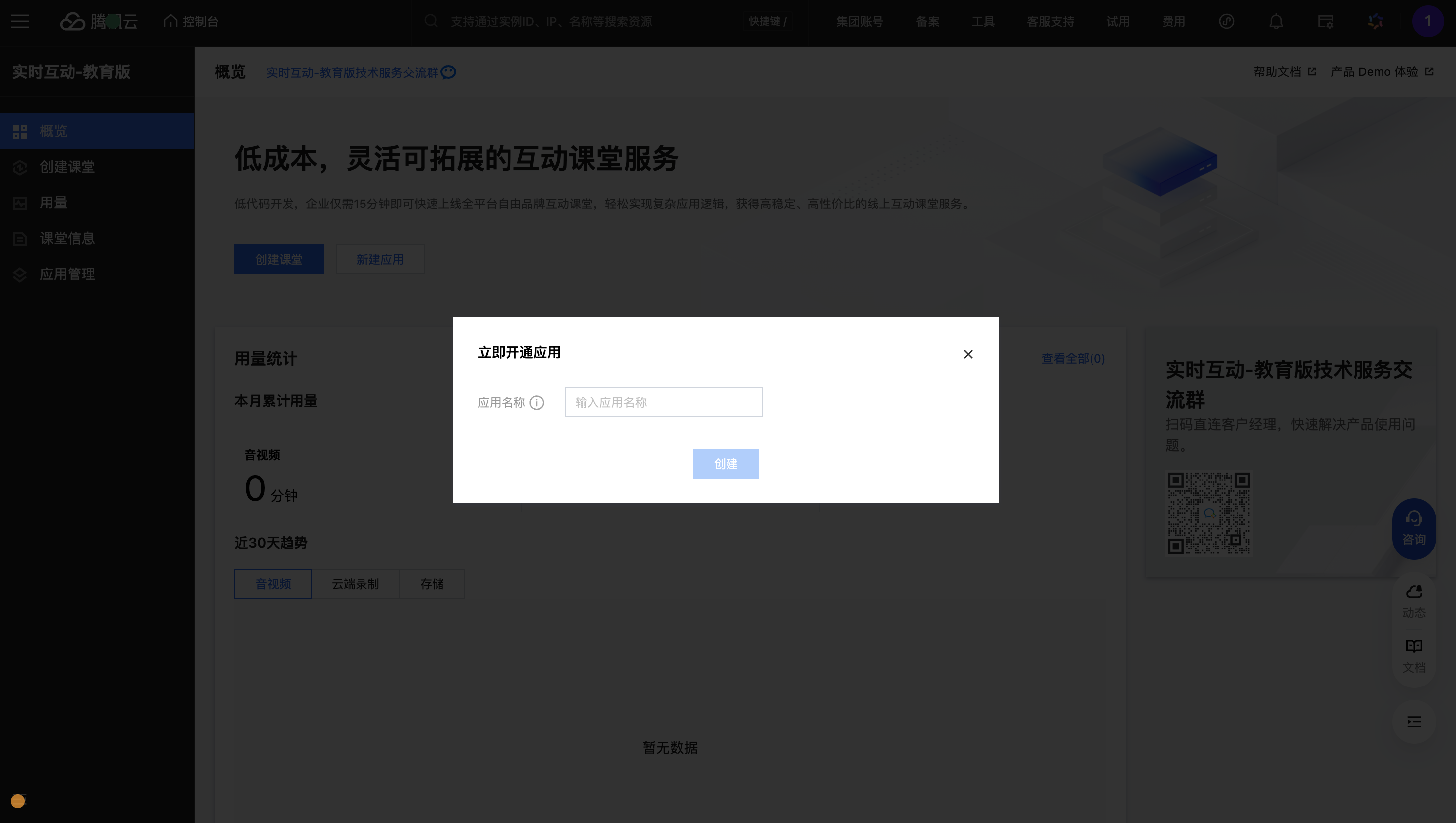 1. 登录 实时互动-教育版 控制台,进入左侧导航栏的概览,选择新建应用。