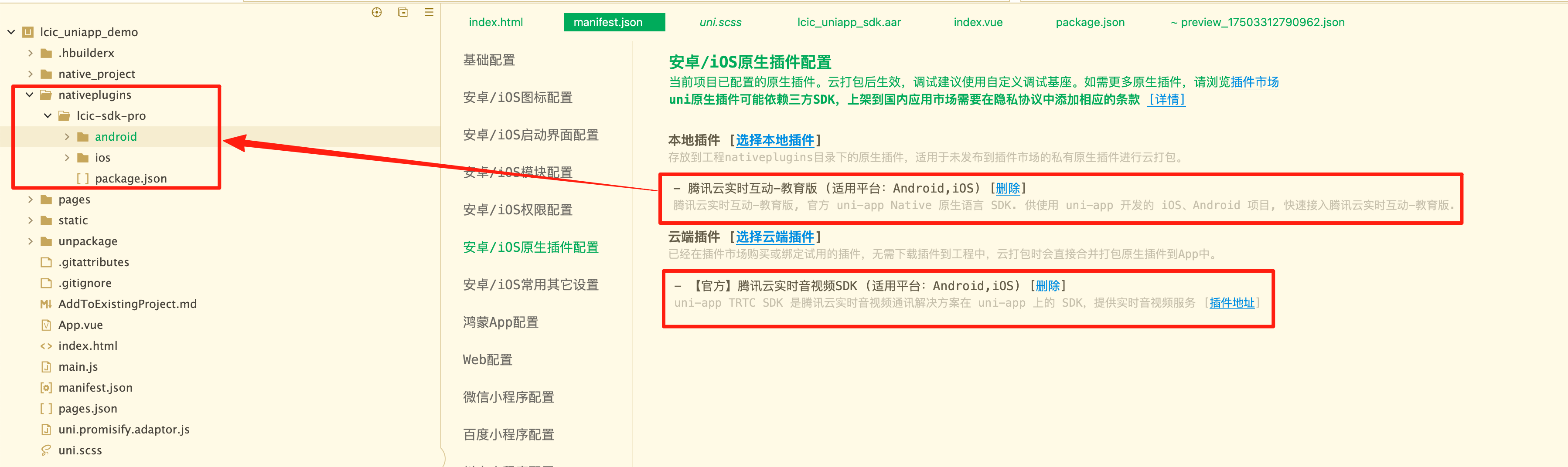 lcic-sdk-pro 本地引入,放置在项目 nativeplugins 文件夹下。如果项目没有该文件夹,请手动创建一个。3. 在 HBuilderX 里找到项目,在 manifest 的 app 原生插件配置中勾选如上两个插件(插件1 & 插件2),如下图所示。