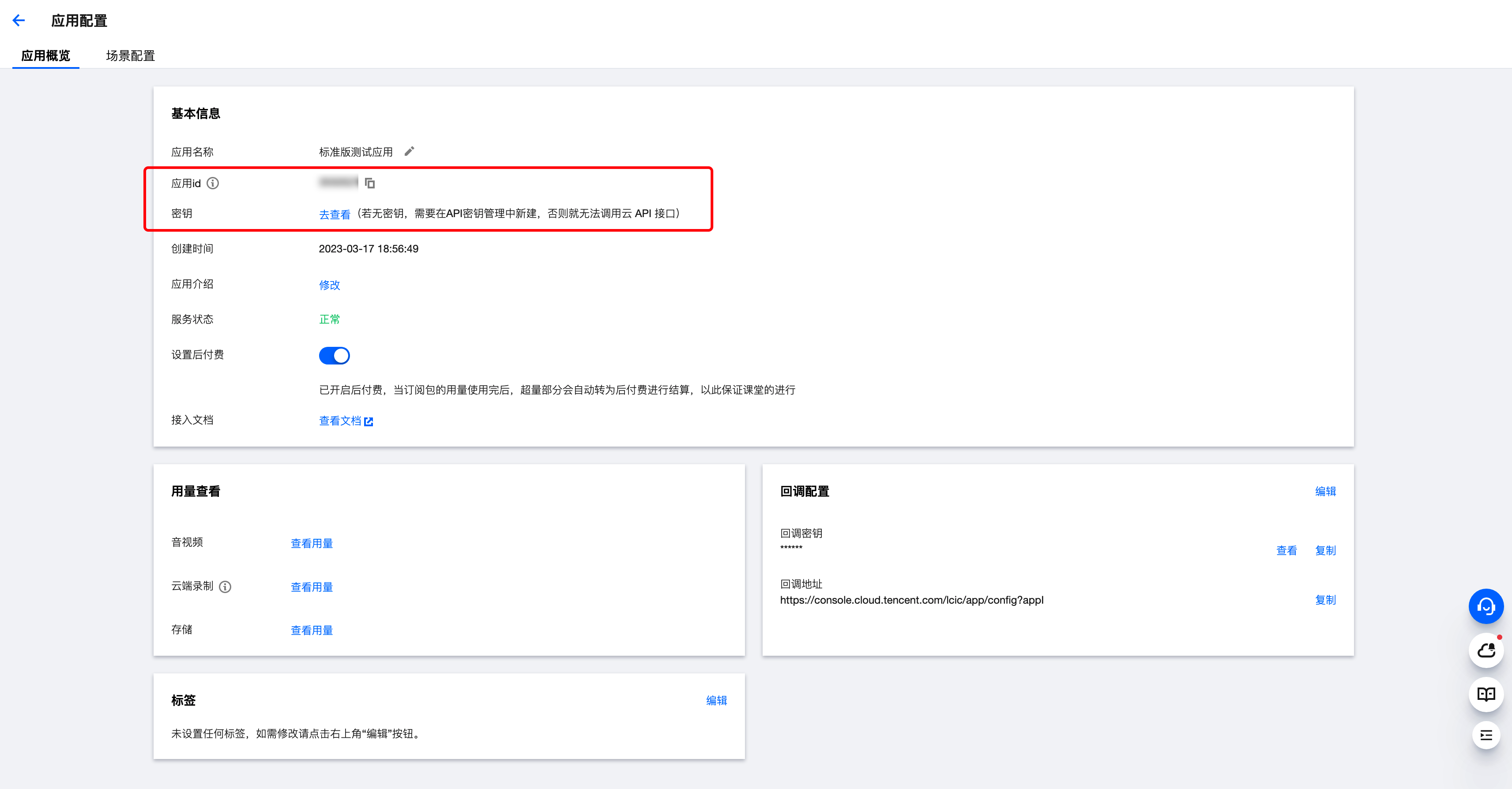 1. 进入应用管理 > 应用配置,获取 SDKAppId 。