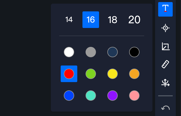 TCIC.SDK.instance.promiseState(TCIC.TMainState.Joined_Class, true).then(() => {TCIC.SDK.instance.promiseState(TCIC.TMainState.Board_Ready, true).then(() => {const tool = TCIC.SDK.instance.getComponent('board-tool-component').getVueInstance();tool.textSize.values = [14, 16, 18, 20, 22, 24]; // 所有需要对用户展示的字体大小值tool.textSize.sizes = [280, 320, 360, 400, 600, 750]; // 上述所有值的映射实际大小值. 该数组每一项均和 values 数组每一项对应TCIC.SDK.instance.getBoard().setTextSize(上面第二项的size值, 用于默认);});});