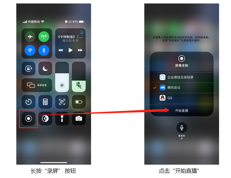 iOS 11:需引导用户在控制中心长按录屏按钮,选择您的 Extension 应用(如“腾讯会议”示例图所示)来启动。