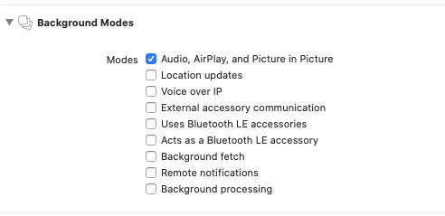 Deployment Target 建议设置为 iOS 11.0。3. 后台模式:主 App 必须开启 Background Modes 中的 “Audio, AirPlay, and Picture in Picture” 选项,以保证后台保活。