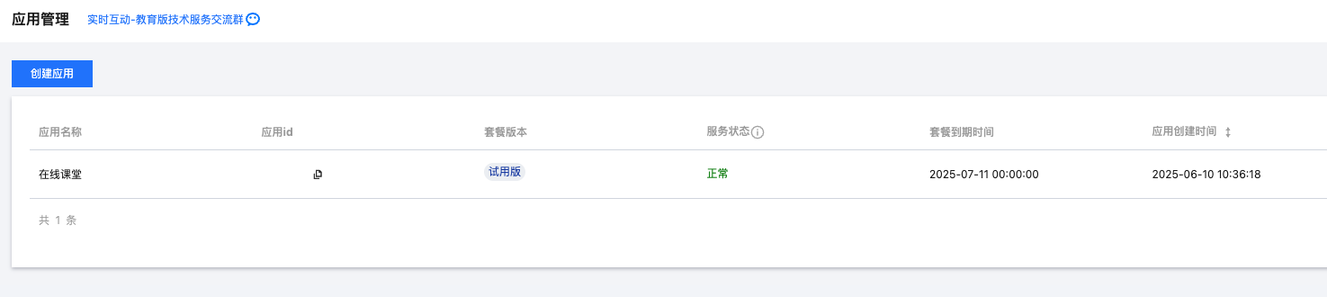 若您已创建应用,可前往应用管理中,选择使用已有应用即可。