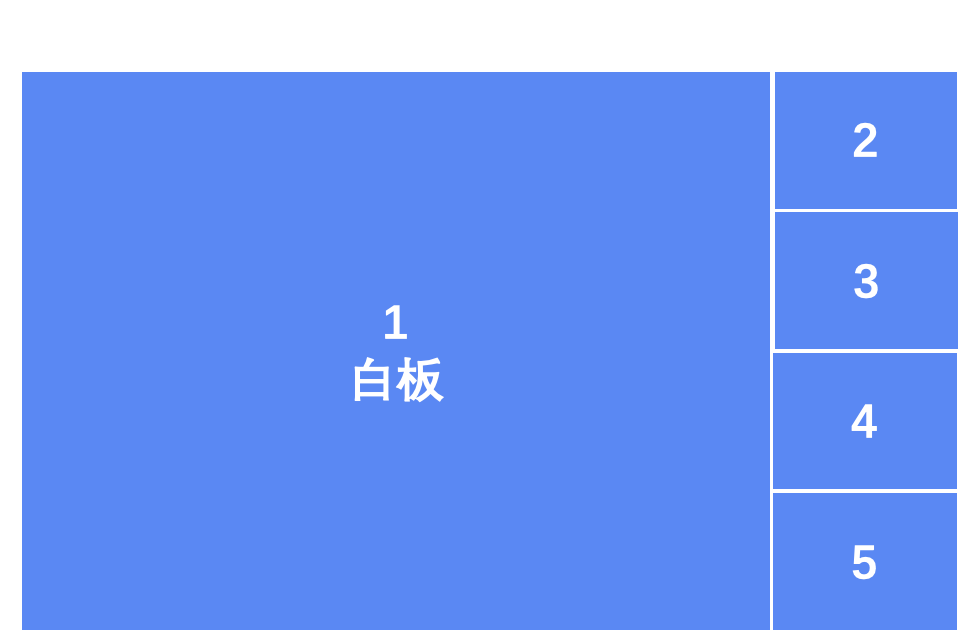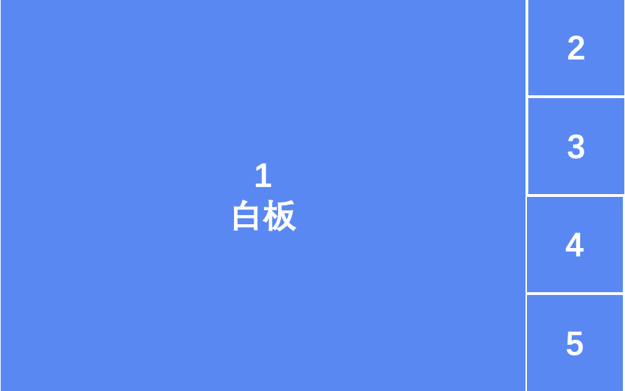 replay_layout = 0 | 教师和学生区域(2、3、4、5所在区域)宽高比为1:1。 当源视频流比例不为1:1时则会裁剪显示。 | ![]() | 如图所示,此类模板分为3个区域: 白板/屏幕共享区域(1所在区域)。 老师区域(2所在区域)。 学生区域(3、4、5所在区域)。 最多录制3路学生(或助教)的视频。根据上台顺序,确认录制学生(或助教)。 |