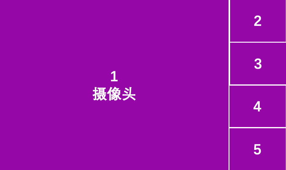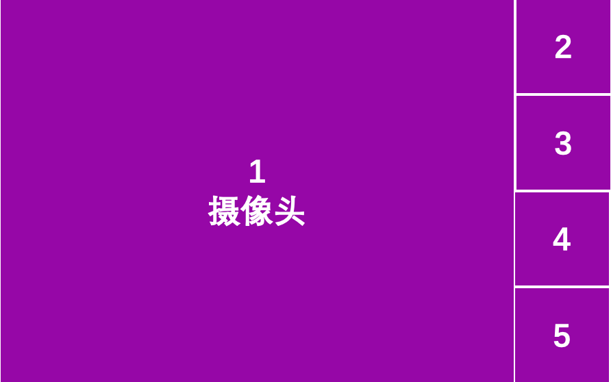 replay_layout = 1 | 教师和学生显示区域(2、3、4、5所在区域)宽高比为1:1。 当源视频流比例不为1:1时则会裁剪显示。 | ![]() | 如图所示,此类模板分为2个区域: 老师区域(1所在区域)。 学生区域(2、3、4、5所在区域)。 最多录制4路学生(或助教)的视频。 当课堂类型为1V0的时候,只存在老师区域(1所在区域),并且会占据全屏。 |