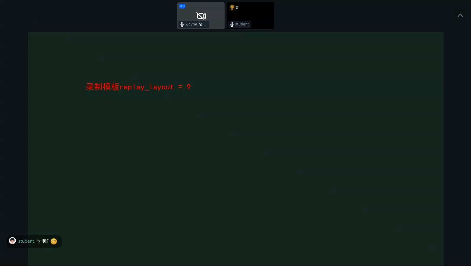 replay_layout = 9 (页面录制) | / | ![]() | 用户视角看到的课堂页面信息。真实还原课堂情况,包括聊天、布局切换等。 当前页面录制仅支持 Web、PC、iOS 和 Android,暂不支持小程序。 |